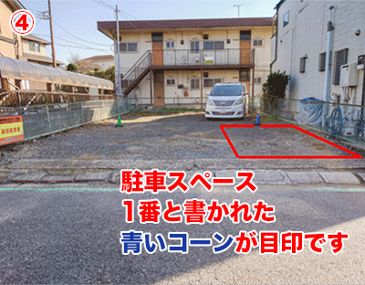 ※「1」と書かれた青いカラーコーンの置いてある場所がこちらの駐車場となります。停め間違いの無いようお願いいたします。